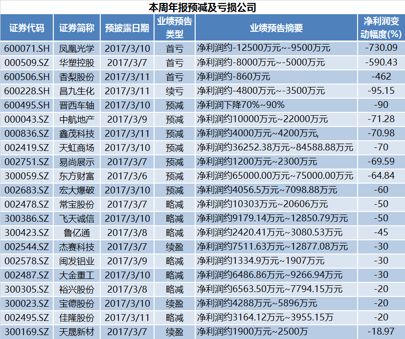 本周预披露公司中,凤凰光学(600071.SH)、华塑控股(000509.SZ)和香梨股份(600506.SH)预告业绩出现首亏。