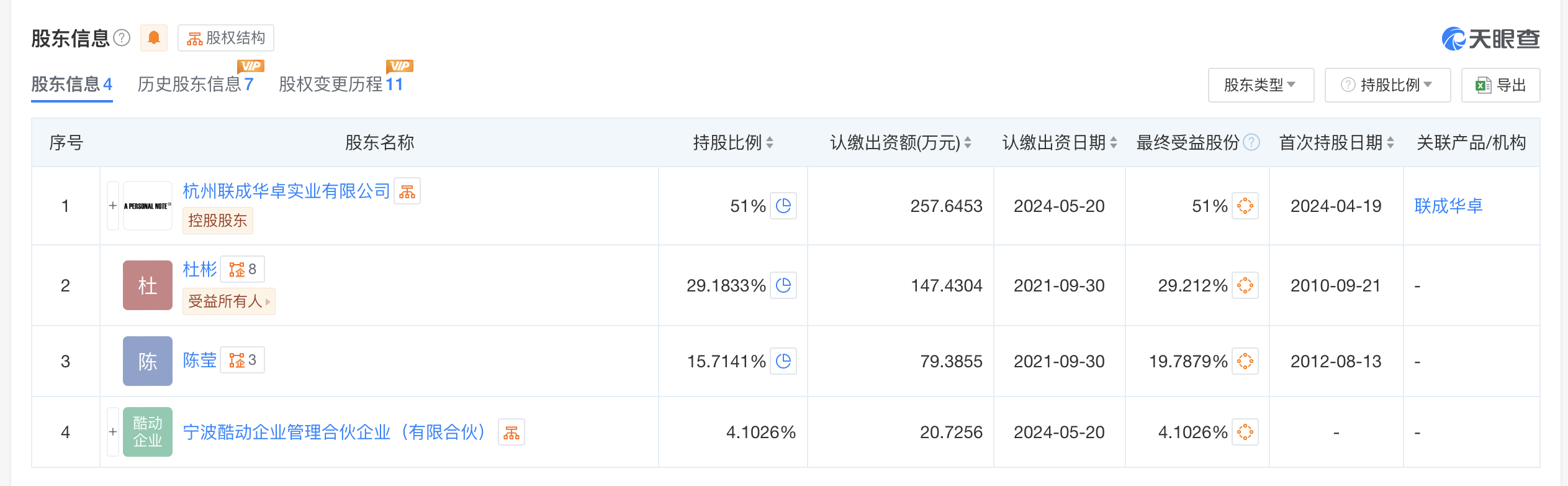 天眼查APP显示,杭州慧聚拥有OMG运动及童装品牌onmygame的相关商标。该公司在2024年4月完成最近一次股权变更,杭州联成华卓实业有限公司(以下简称“联成华卓”)加入股东行列并成为控股股东,持股51%。联成华卓即为江南布衣关联公司。