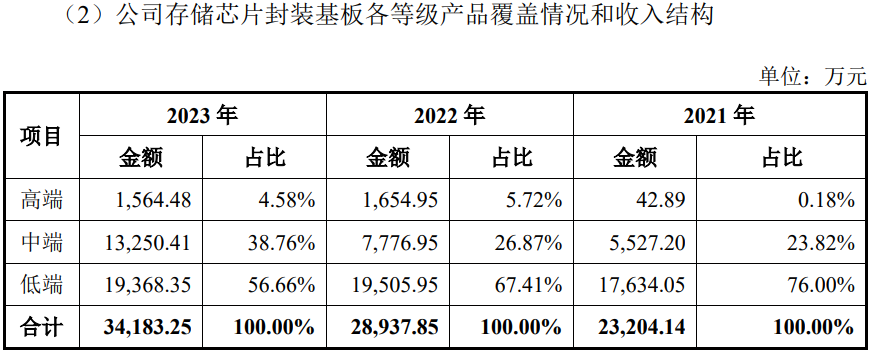 据和美精艺披露,2021年至2023年,该公司存储芯片封装基板低端产品收入分别为17634.05万元、19505.95万元以及19368.35万元,占比为76%、67.41%以及56.66%。该类产品主要应用于存储卡与存储盘等面向个人消费的终端产品,个人消费用户对存储容量需求小于企业级与工业级用户,此类产品的线路精细度与存储容量较低,相对低端。