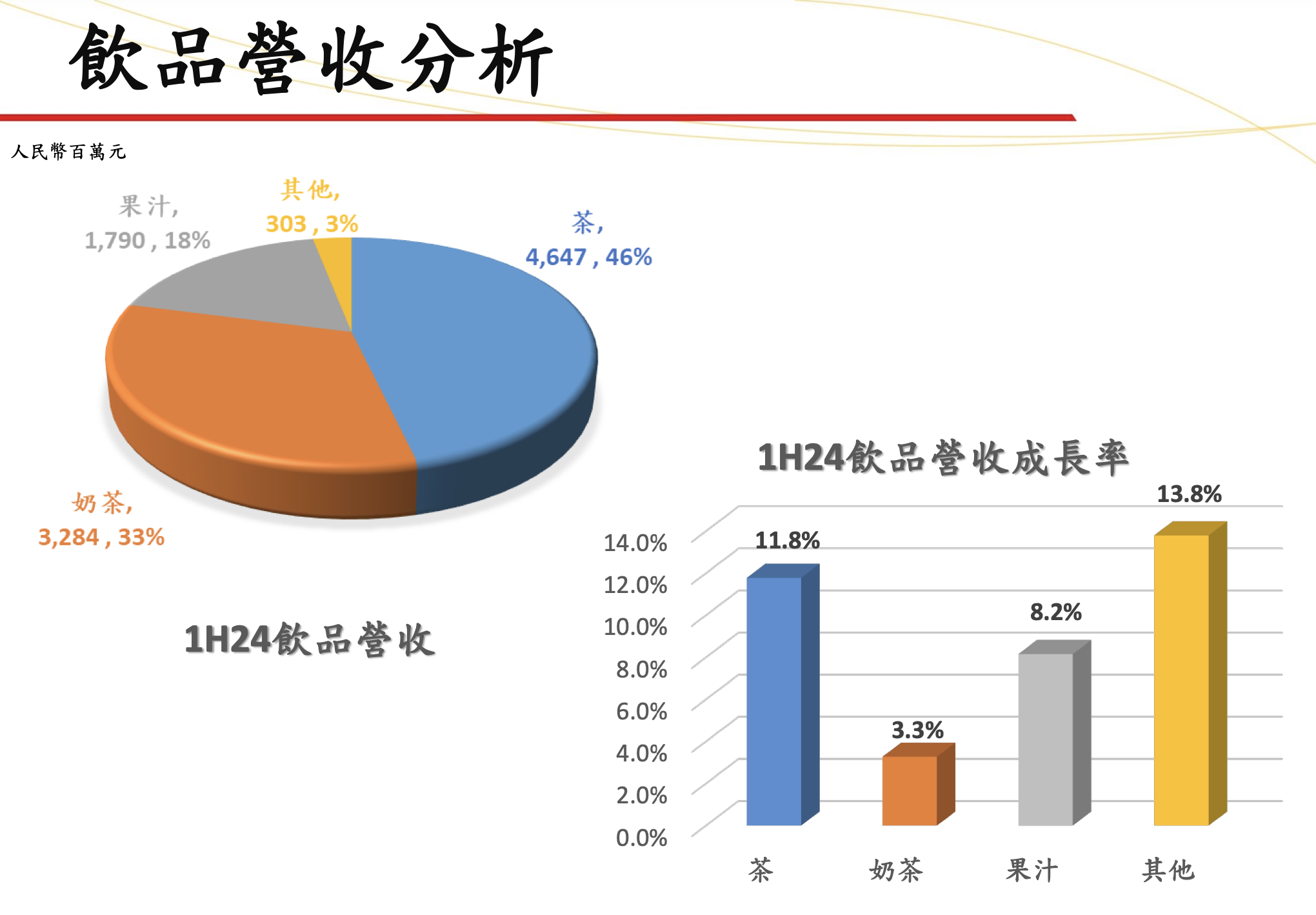 其中,增幅最大的是茶饮料,上半年收益约为46.47亿元,同比上升11.8%。此外,果汁收益约为17.90亿元,同比上升8.2%;奶茶收益约为32.84亿元,同比上升3.3%。咖啡和包装水业务收益占比较小,并未披露具体金额。