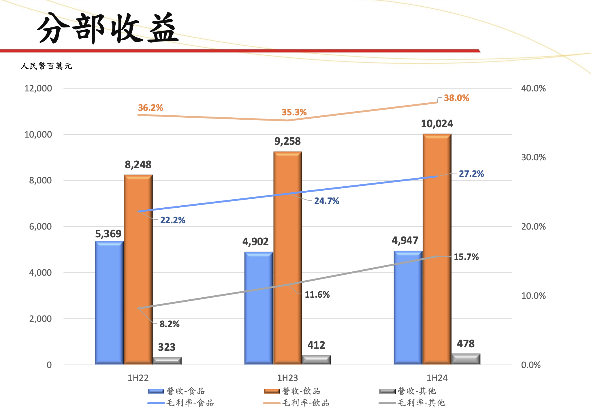 饮料板块仍是统一中控业绩增长的主要动力。报告期内收益约为100.24亿元,占集团总收益64.9%,同比上升8.3%。