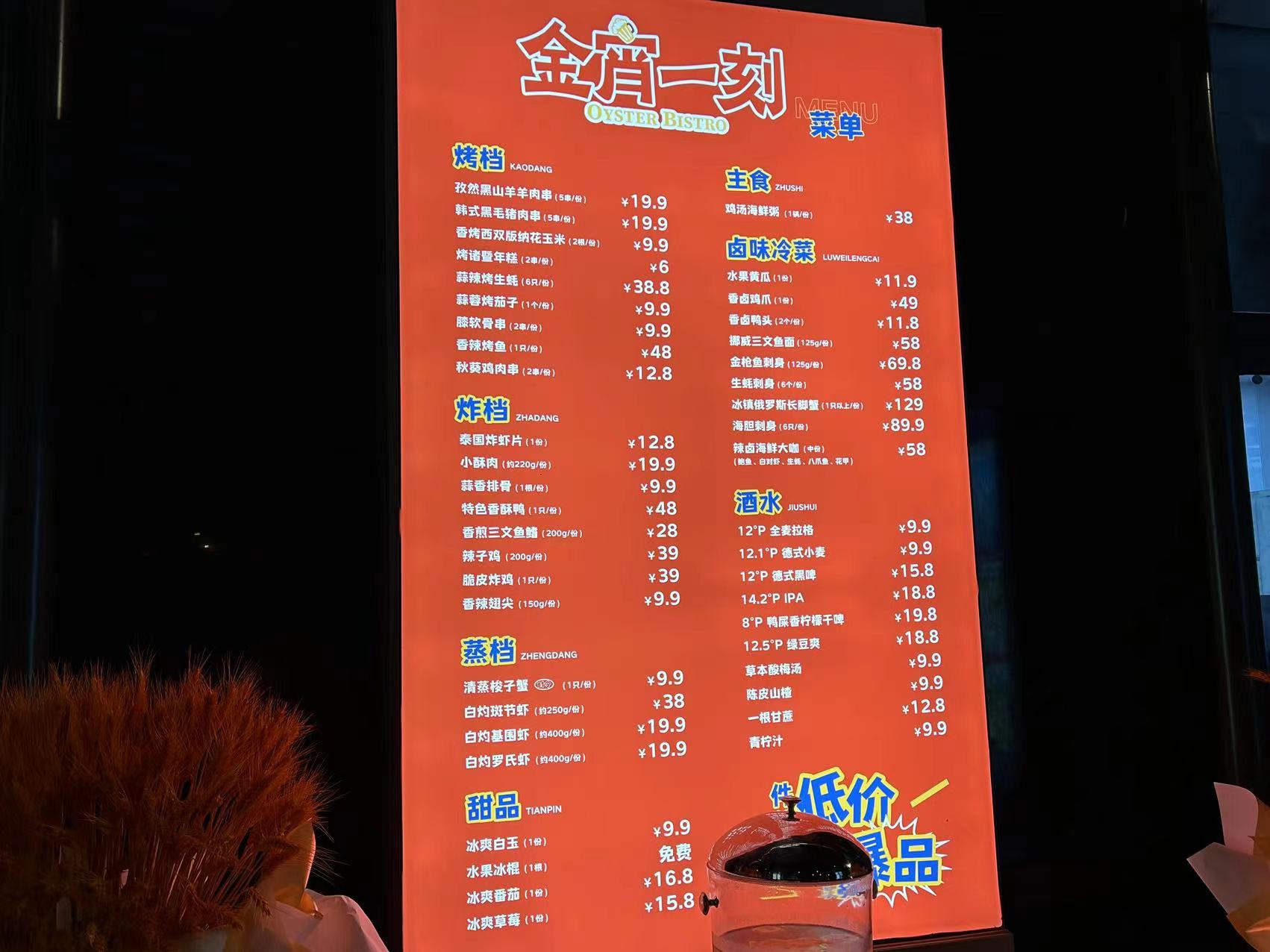 此外,与传统海鲜店相比,“金宵一刻”店内拥有精酿吧台,像小酒馆一样设置了丰富的瓶装酒类及1000ml大杯精酿。除去大范围灯箱外,门店装修较为简单,餐品使用不锈钢餐盘盛装,室内餐桌上铺有便于翻台的塑料布。厨房/加工操作间未见厨师,而是特高温烤炉,加快了出品时间。界面新闻于现场时,平均约5分钟就可以出一道烧烤、炸物等菜品——看上去一切都符合一家硬折扣店该有的模样。