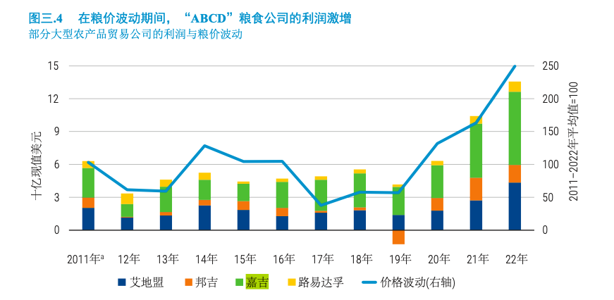 过去几年,四大粮商也因此获得高额利润。联合国发布的《2023贸易和发展报告》显示,粮价波动期间, “ABCD” 四大粮商利润激增。
