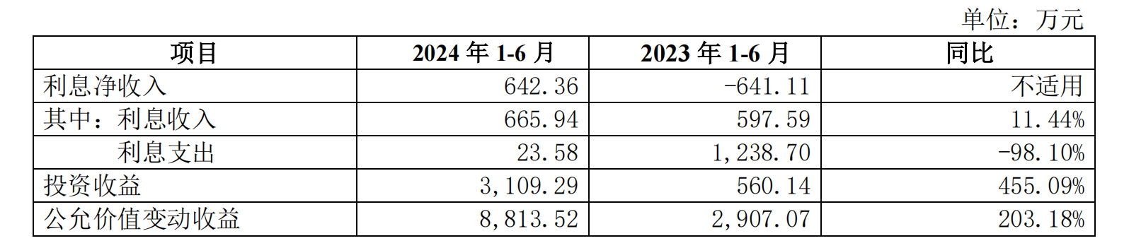 上半年,建元信托实现投资收益3109.29万元,同比大涨4.55倍;实现公允价值变动收益8813.52万元,同比大增2.03倍。财报指出,两项指标的大涨均主要系交易性金融资产投资所获。