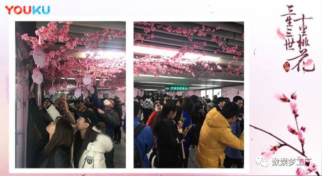 2017年2月14日,情人节,北京地铁西单站忽然在一夜之间“长”出了十里桃林。“十里桃花”灼灼其华,电视剧中夜华答应为素素打造的桃林承诺还没兑现,把粉丝当情人的优酷已抢先一步。