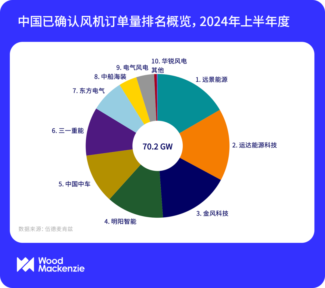 近期,伍德麦肯兹风电研究团队发布的最新研究报告《中国风电整机商风机订单量排名:2024年上半年度数据统计及分析》显示,今年上半年,中国市场风机订单量超过70 GW,再创历史新高。
