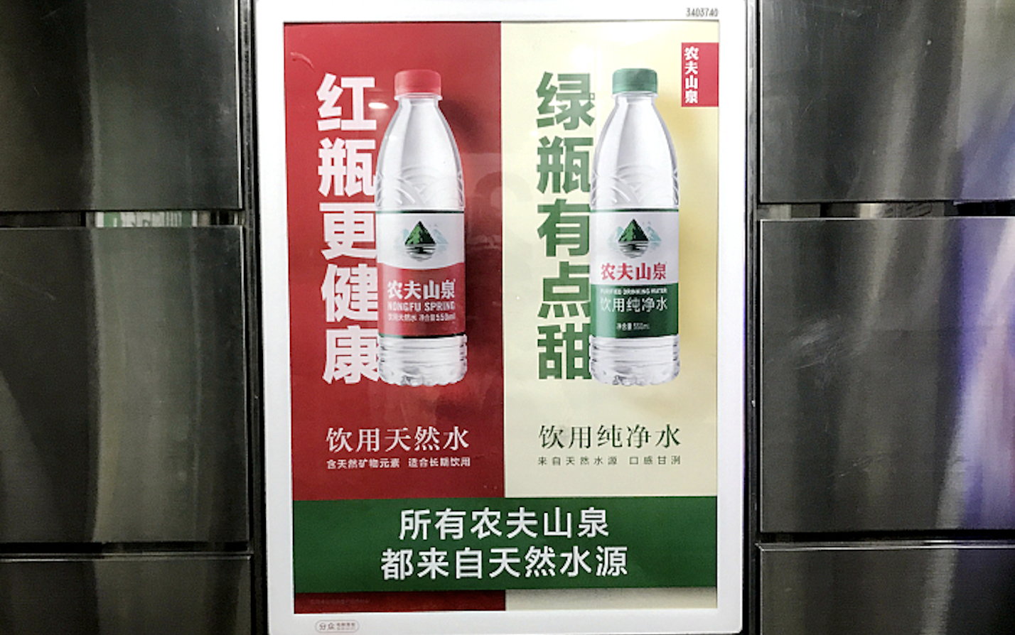 在6月以来农夫山泉投放的户外广告和综艺广告当中,两款农夫山泉瓶装水的广告语形成明显对比,尤其是同一块户外(公交站、地铁站)广告牌被划分为左右两个区域,分别为红瓶天然水和绿瓶包装的纯净水,而广告语“红瓶更健康”和“绿瓶有点甜”显得分外醒目,连接两款水产品的则是在产品下方注明的“所有农夫山泉都来自天然水源”字样。