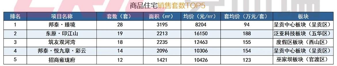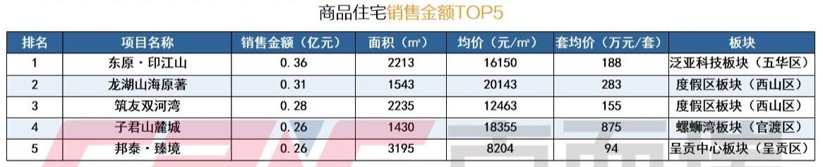 高单价、高总价的高端改善型楼盘保持高位去化,价格坚挺。龙湖·山海原著、子君山麓城2个项目上榜,分别销售0.31亿元、0.26亿元,成交均价为20143元/㎡、18355元/㎡。