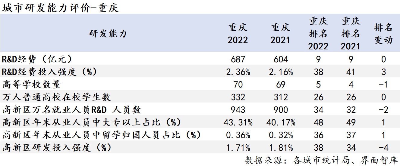 在研发能力的多个二级指标中,重庆的高校数量和R&D经费排名较为靠前,分列第五和第九位。尽管其他指标大部分都出现了小幅增长,并且与上年相比部分指标排名也有所提升,但排名整体相对靠后。