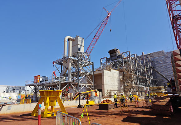 在位于皮尔巴拉地区的哈默斯利山脉上,一座24米高的初级破碎机正在紧张的搭建过程中。它的用途是将运送至此的铁矿石进行破碎,由直径1米加工为直径25厘米以下,并装入铁矿石传送带中,运往18公里外的次级破碎机进一步加工。