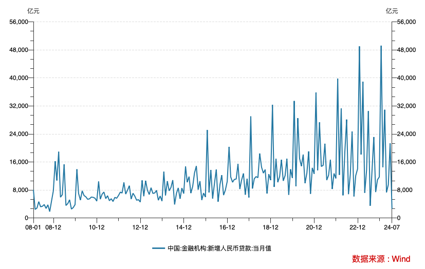 近日,央行公布的数据显示,2024年7月新增人民币贷款2600亿元,同比少增859亿元;7月新增社会融资规模为7708亿元,同比多增2342亿元。