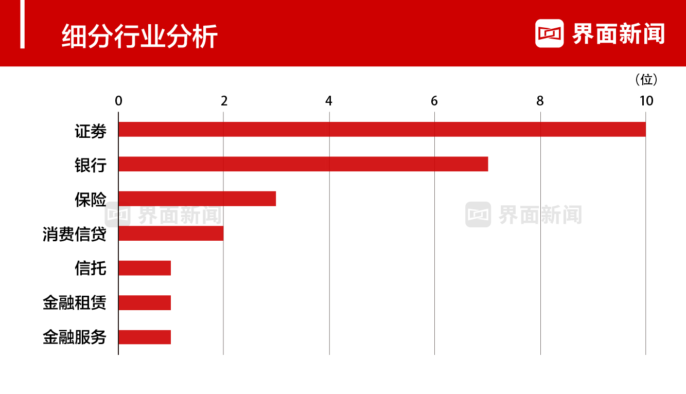 从公司主营业务来看,证券占据多数,有10家上榜。传统银行排名第二,有7家上榜,保险行业排名第三,有3家上榜,分别是中国平安、中国财险以及众安在线。