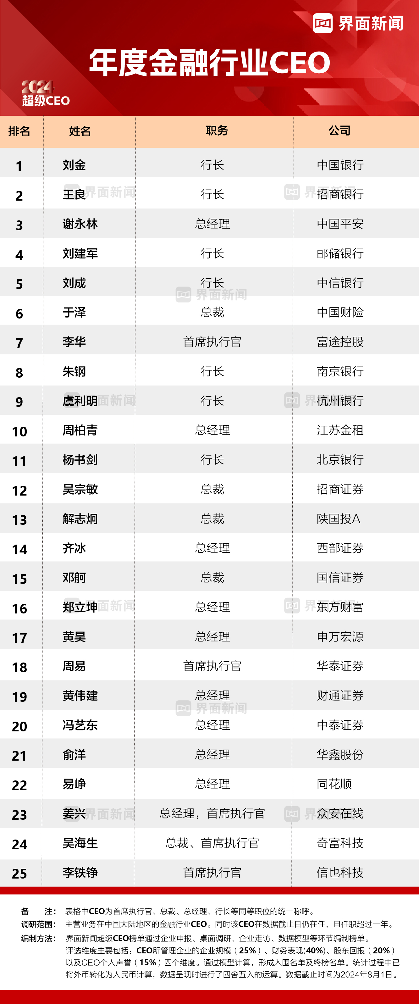 在界面新闻2024年度金融行业CEO榜单上,最终有25位CEO上榜。其中CEO是对CEO、总裁、总经理、行长等同等职位的统称。