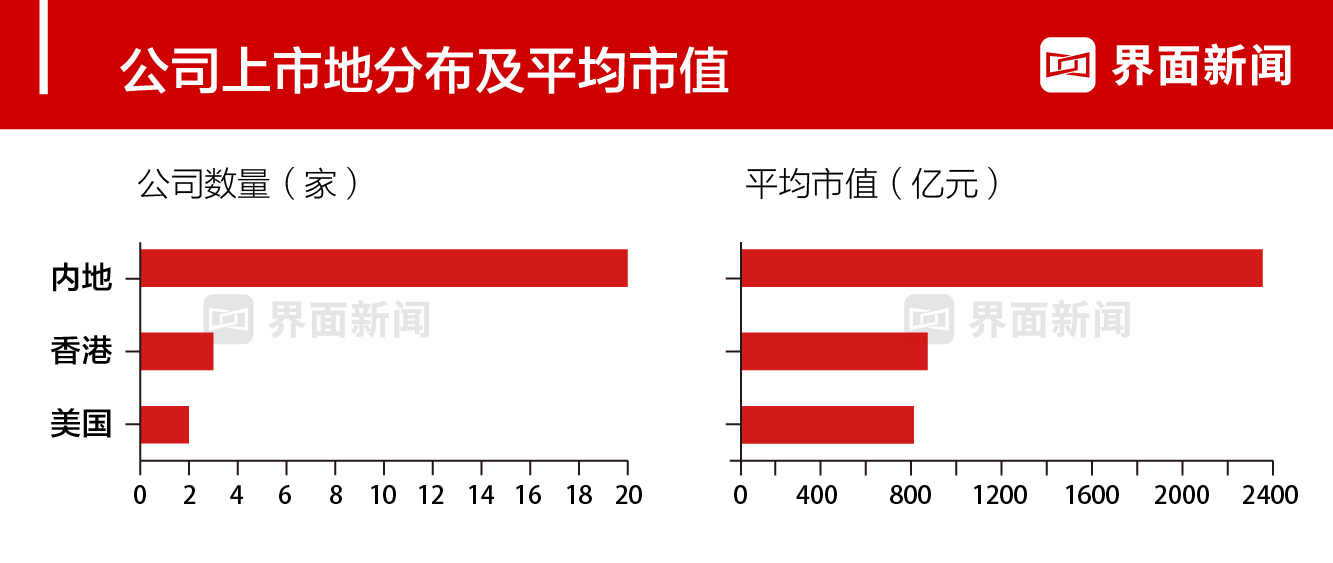 这25位CEO所在的公司,有20家在内地上市,3家在香港上市,2家在美国上市(多地上市的,以A股,港股,美股为次序)。从平均市值来看,A股市场、港股市场以及美股市场的平均市值分别2309亿元、828亿元以及767亿元。