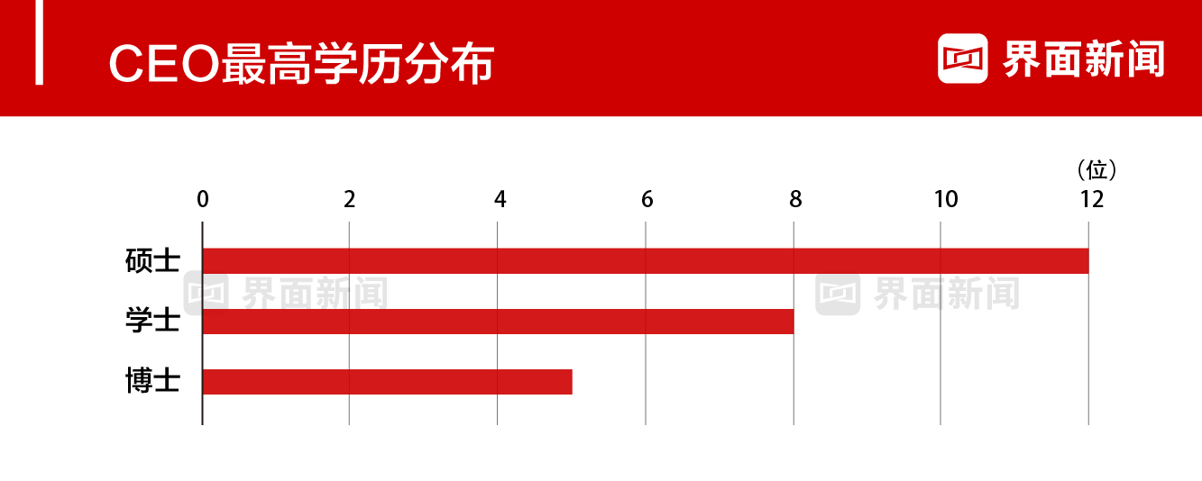 在25位上榜的CEO中,硕士和博士分别有12位和5位;有16位公开了毕业的专业,大部分皆与经济或管理相关。