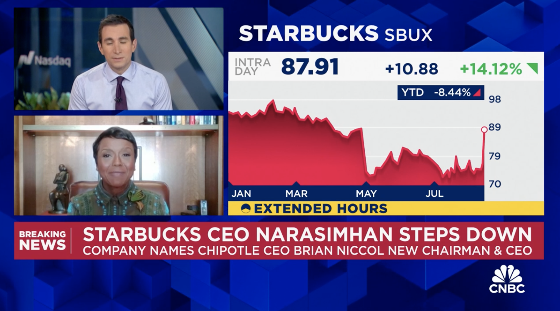 此外,星巴克在7月底曾迎来新的投资者并持有大量少数股份,即美国投资管理公司Elliott Investment Management(下称“Elliott”)。据外媒报道,Elliott曾向星巴克协商保留纳思瀚职位。而发布人事变动消息后,8月13日Mellody Hobson曾在接受CNBC的采访时透露,目前董事会并未与Elliott就该决定进行讨论。