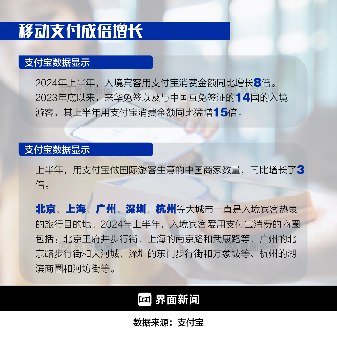 为了更好地买买买、逛逛逛,不少老外还学会了使用中国的移动支付。据支付宝数据,2024年上半年,入境外宾用支付宝消费额同比增长8倍,用支付宝做国际游客生意的中国商户数量,同比增长了3倍。