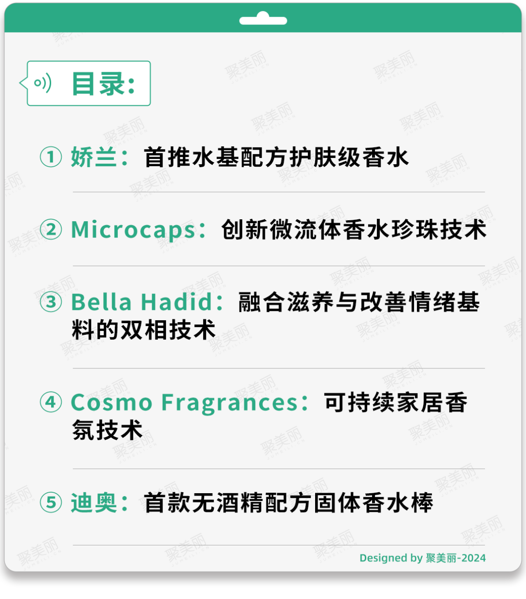 此外,在2024年世界香水大会上,Cosmo International Fragrances还推出一款专为无酒精香水设计的100%天然来源和水基技术——AquaElixir技术,这项先进的绿色技术提供了卓越的感官性能和亲肤解决方案,即使在高浓度香料下也能保持完全透明。