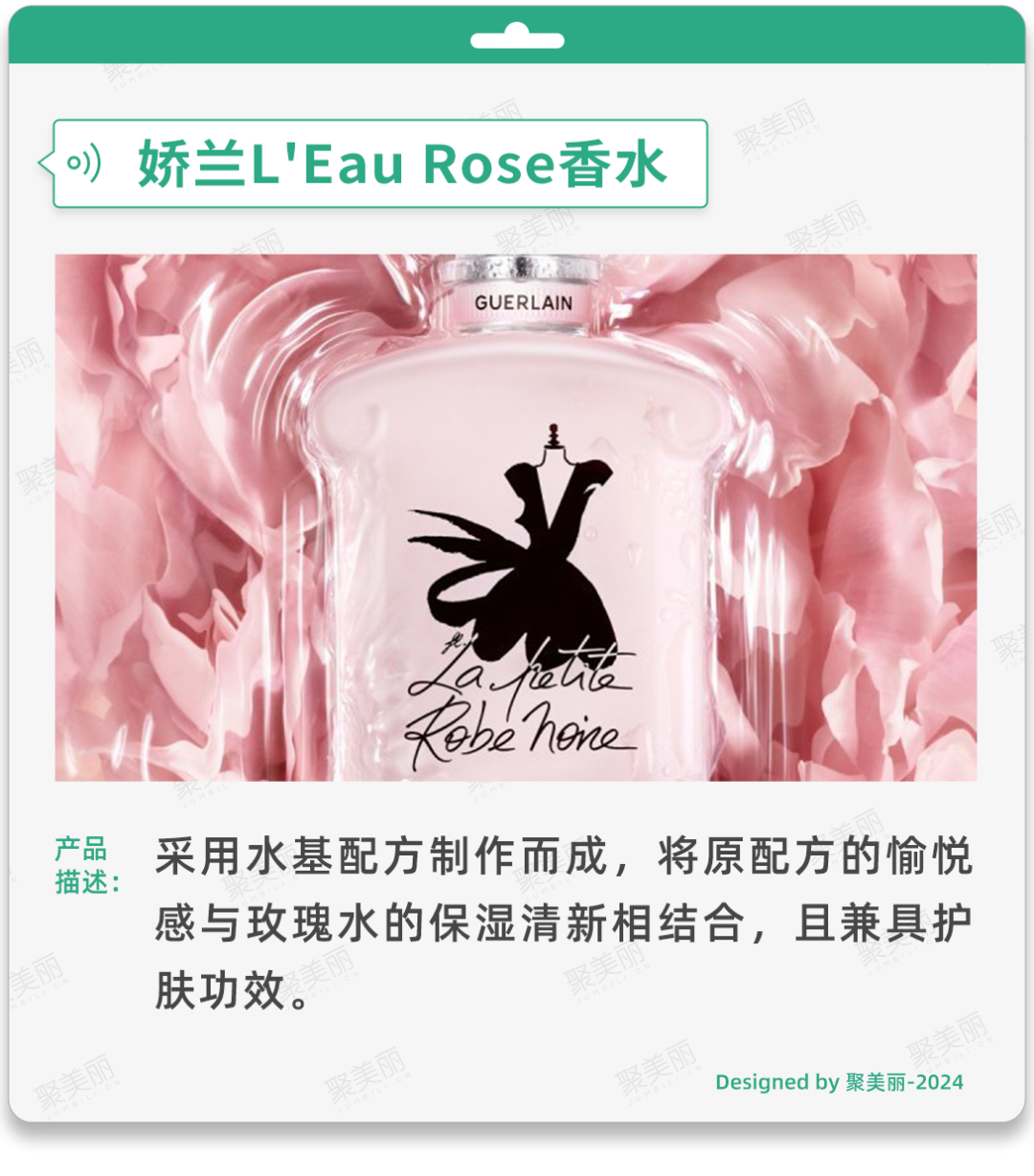 聚美丽了解到,L'Eau Rose香水采用水基配方制作而成,一方面将原配方的愉悦感与玫瑰水的保湿清新相结合,另一方面无酒精配方对肌肤更加温和,可发挥护肤功效。