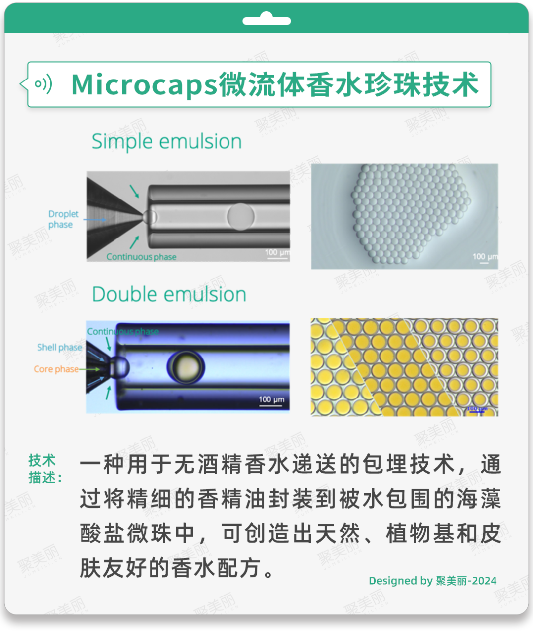 聚美丽还了解到,这项技术的开发是为了在水中创造一种均匀的香油混合物,通过将精细的香精油封装到被水包围的海藻酸盐微珠中,从而有可能创造出天然、植物基和皮肤友好的香水配方。