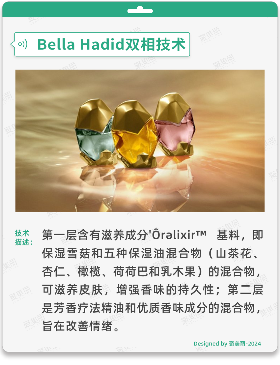 聚美丽了解到,这项技术独特之处在于,采用双相香味设计,将不含酒精的保湿香水与护肤成分精妙融合,除了拥有迷人的香气,这款香水还能够护肤和护发。