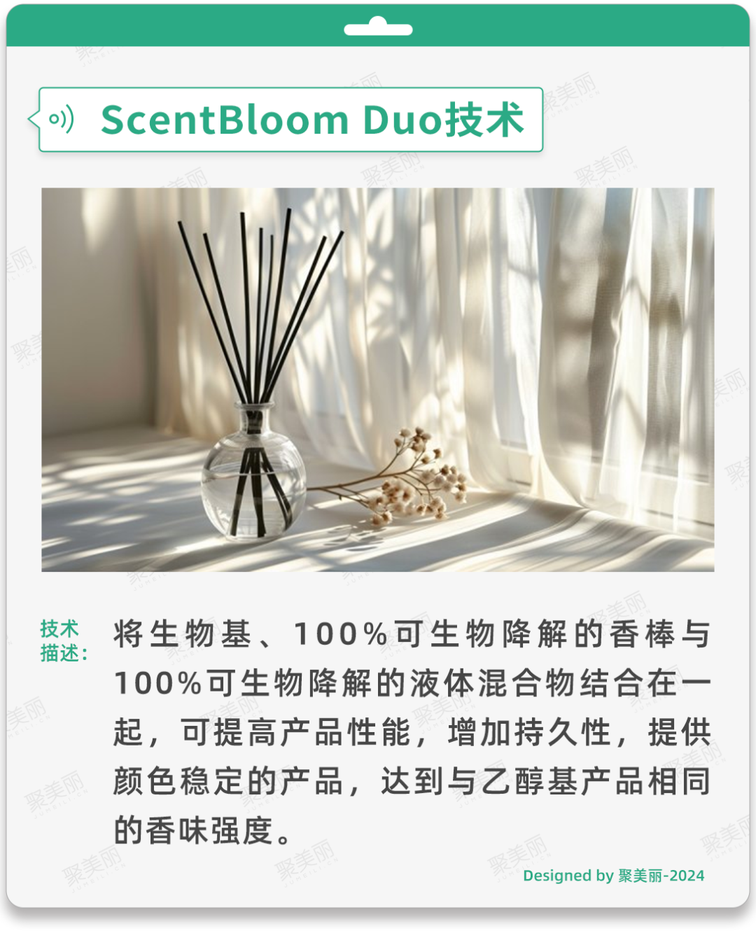 聚美丽了解到,ScentBloom Duo技术将生物基、100% 可生物降解的香棒与100%可生物降解的液体混合物结合在一起,利用该技术生产的产品更加安全、环保,符合当下可持续发展理念。