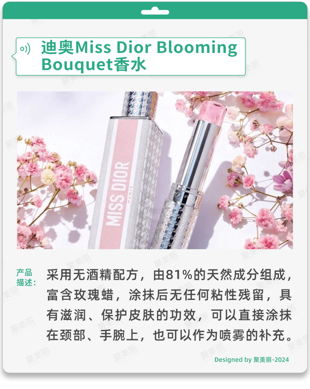 继2022年推出首款不含酒精、100%天然配方的J'Adore Parfum d'Eau香水产品后,迪奥又与化妆品和香水公司Albéa合作推出一款基于无酒精配方的固体香水棒Miss Dior Blooming Bouquet。