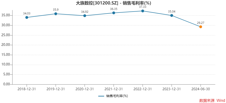 尽管大族数控过去几年业绩有升有降,但公司销售毛利率均保持在35%左右。而今年上半年,公司销售毛利率大降超过5个百分点至30%之下,为29.27%。