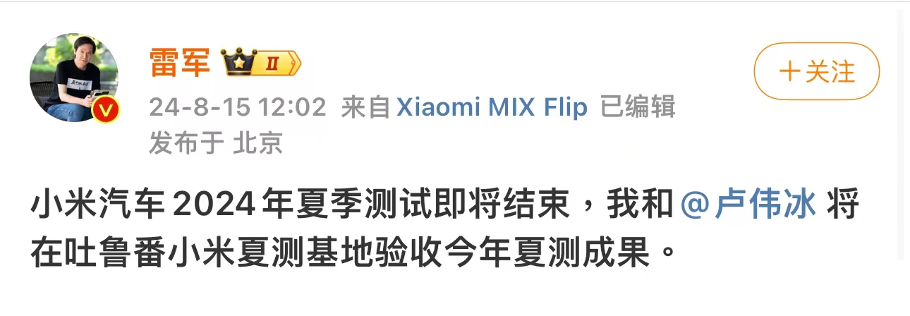 雷军8月15日在个人微博宣布,小米汽车2024年夏季测试即将结束,他将和小米集团总裁卢伟冰在吐鲁番小米夏测基地验收今年夏测成果。
