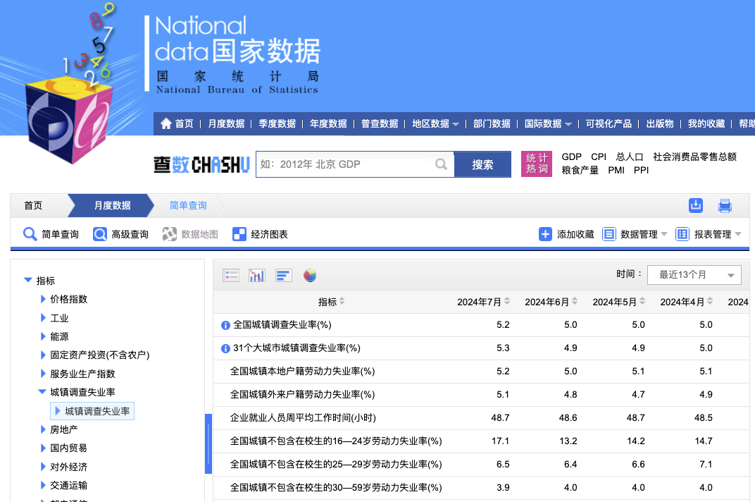 国家统计局发布7月份分年龄组失业率数据:7月份,全国城镇不包含在校生的16-24岁劳动力失业率为17.1%,不包含在校生的25-29岁劳动力失业率为6.5%,不包含在校生的30-59岁劳动力失业率为3.9%。