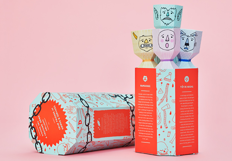 他们选取TíoDe Nadal、Yule Cat、 Kallikantzaroi以及Namahage四个角色,把故事用文字方式呈现在拉炮的外包装上,让人一眼就可以了解。为了让客户有更深入的体验,Goods & Services还设计了一款在线点击的游戏应用程序来展示每个角色。