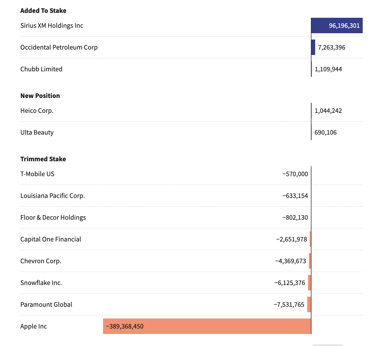 从股票来看,巴菲特大幅减持了苹果、派拉蒙、云存储公司Snowflake、雪佛龙等8只股票,增持美国卫星广播公司、西方石油和丘博保险集团3只股票,同时新建了两个少量仓位,买入美妆公司Ulta Beauty和海科航空。
