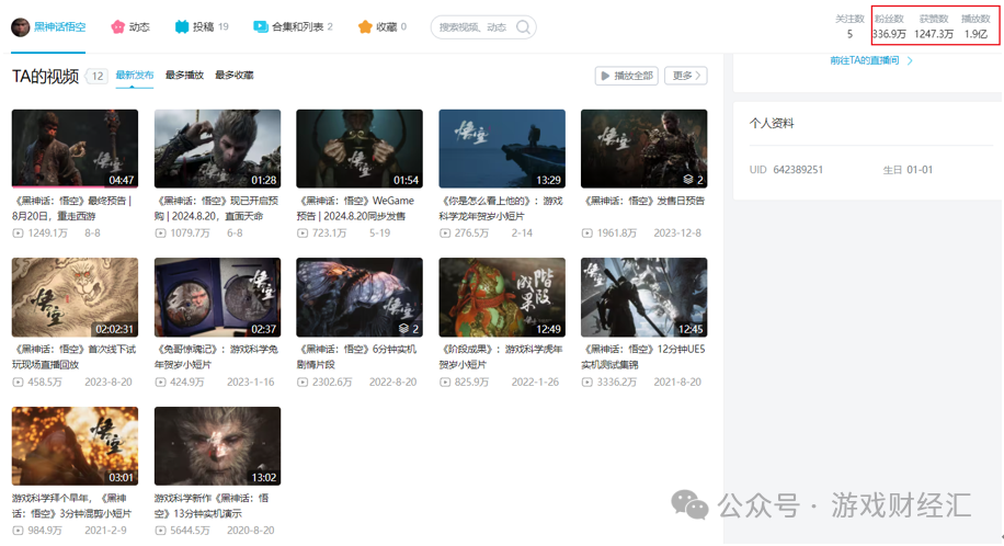 在B站上,《黑神话:悟空》仅通过12个视频就涨粉超过330万,累计播放量接近2亿次。