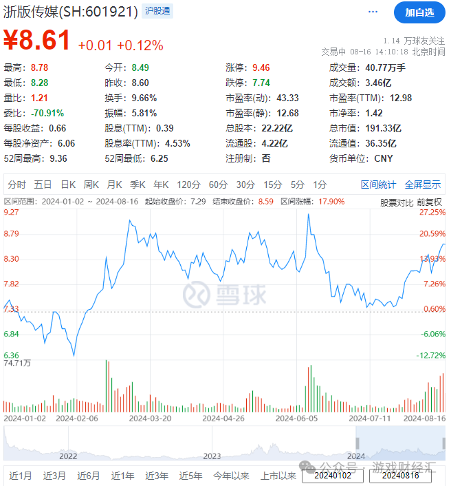 雪球数据显示,浙版传媒今年以来累计涨幅超17%。其中,年内股价高点出现在6月中旬。