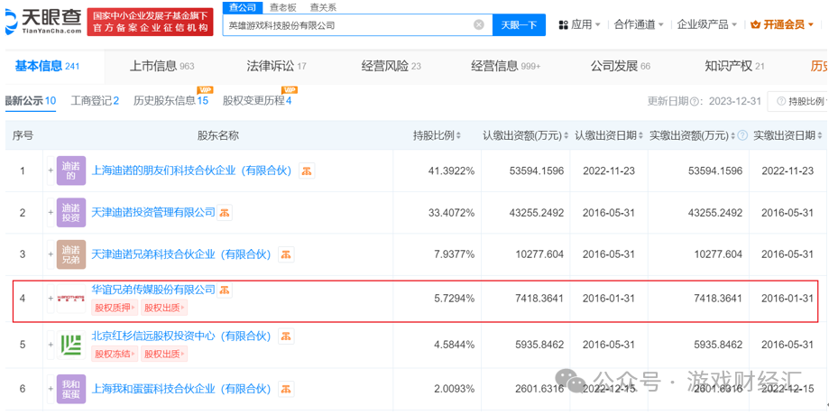 据天眼查显示,英雄游戏为《黑神话:悟空》开发商游戏科学第二大参股公司,持有19%的股份,由此推算,华谊兄弟间接持有《黑神话:悟空》开发公司游戏科学约1%的股份。