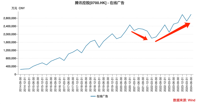 这就使得2022年的腾讯广告业务受宏观经济影响非常之大,受彼时一系列不利因素影响该业务出现了大幅度的回调。但2023年之后,该业务则以更迅猛的速度反弹,成为近几个季度腾讯财报最亮眼的部分,而此时宏观经济总需求仍未迎来”大反攻“。