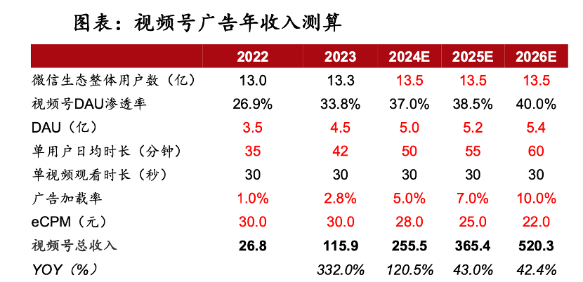 上图为方正证券制作的视频号广告收入测算,其广告收入的高速增长乃是建立在广告加载率和产品总时长双重因素之上的。