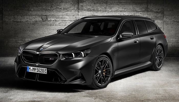 在外观设计上,新款M5旅行版基本与轿车版车型保持一致,车头配备独特的双格栅和多边形LED大灯,增强了车辆的辨识度和动感。车身侧面展现出标准的旅行车构造,配有宽大的侧翼子板,门版采用的折角设计一定程度上降低了车辆的视觉重心。尾部设计采用狭长尾灯和双边四出排气,强调运动性能。