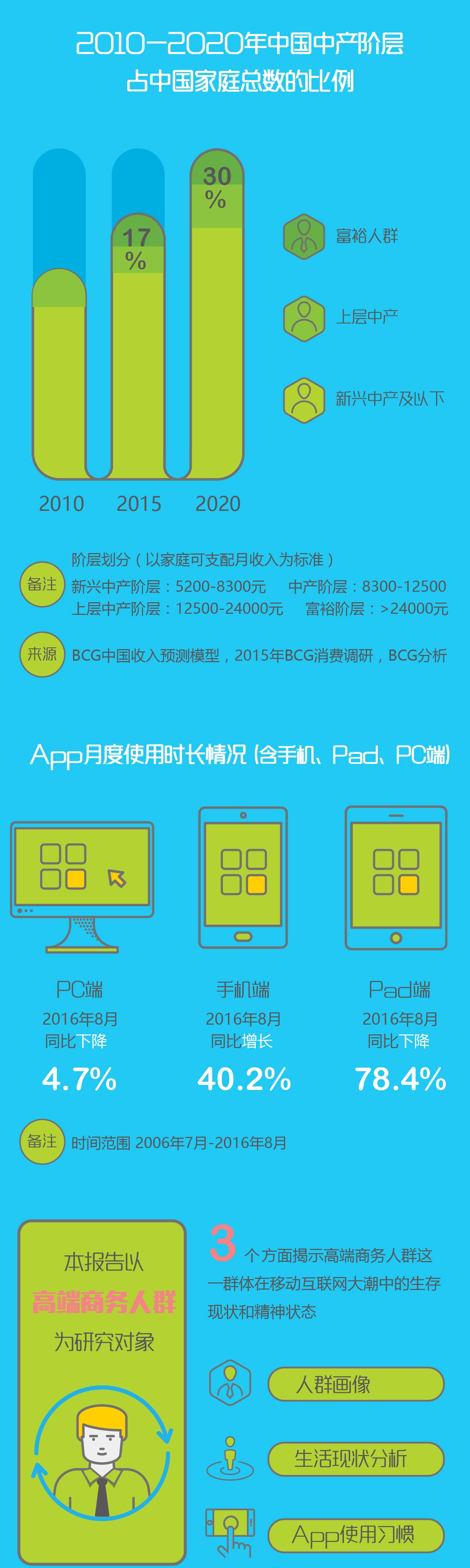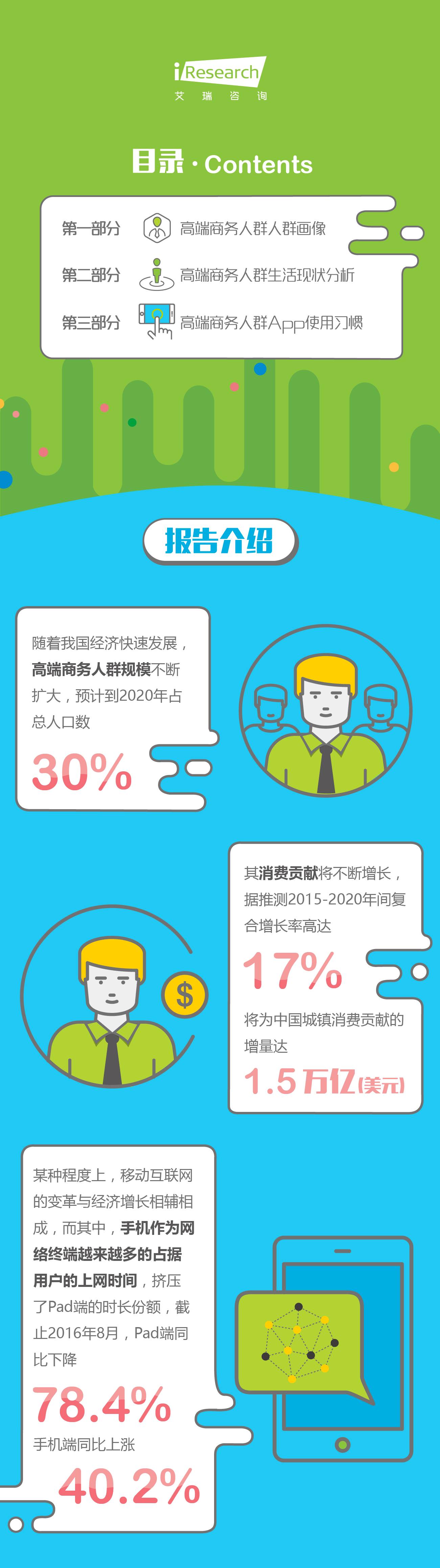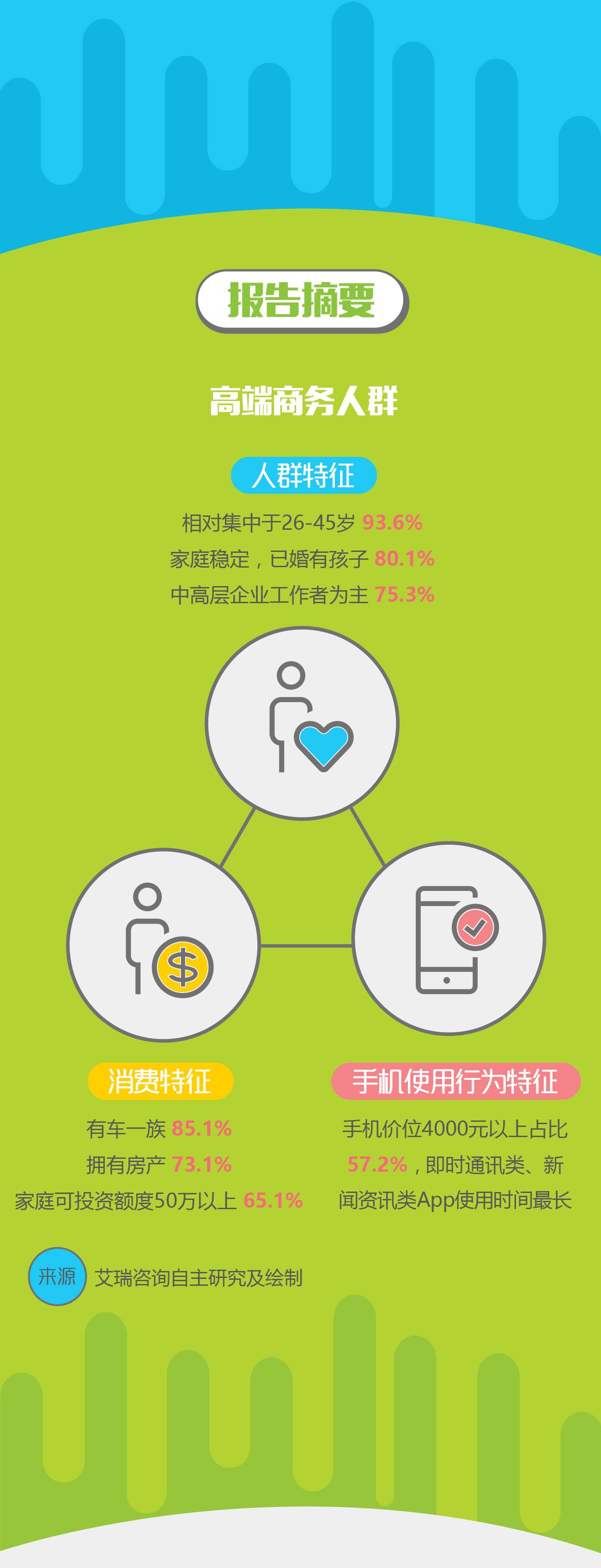 艾瑞咨询于近日发布了《2017年中国高端商务人群App使用习惯盘点白皮书》,小编从53页PPT中整理出有关高端商务人群的16个特征,并以长图的形式展示给大家,帮助大家深度理解高端商务人群这一群体。