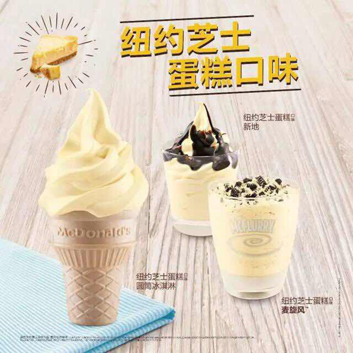 麦当劳近日推出“纽约芝士蛋糕”口味的冰淇淋系列产品,包括圆筒冰淇淋、新地和麦旋风。目前已在中国市场上市。