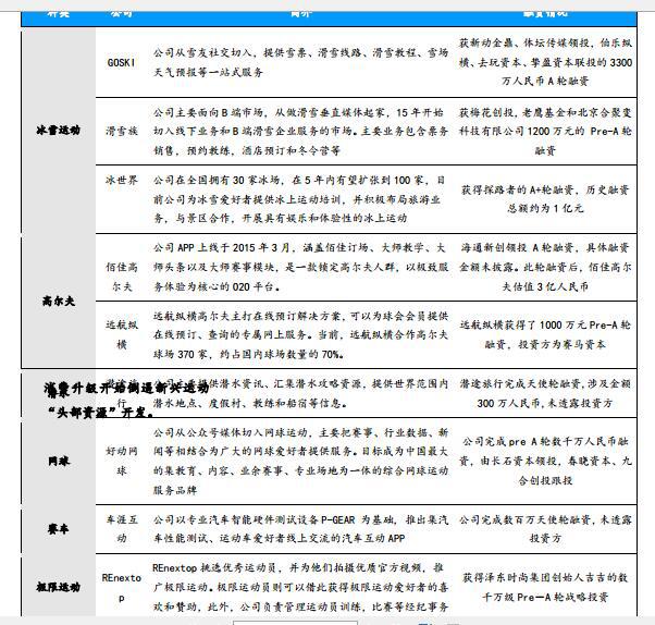 值得关注的是,消费升级使得体育产业不再只是几个传统体育运动的“独角戏”, 冰雪、潜水、高尔夫、网球、赛车、极限运动等初创项目获得融资。