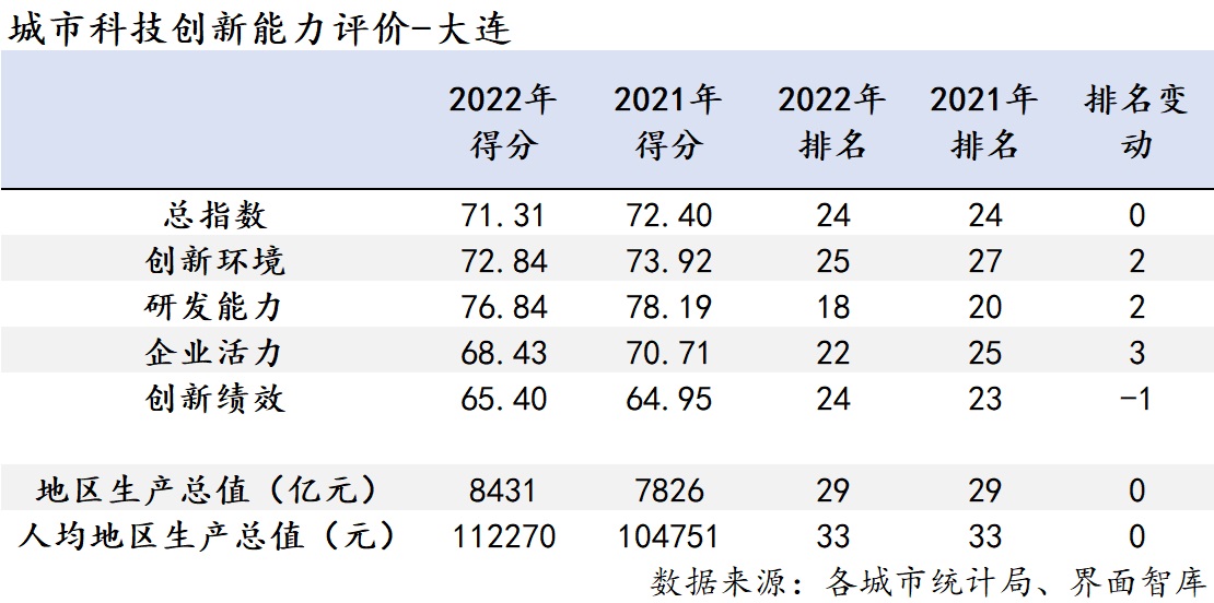 在创新环境方面,大连的得分为72.84,排名从上年的第27名上升至第25名。