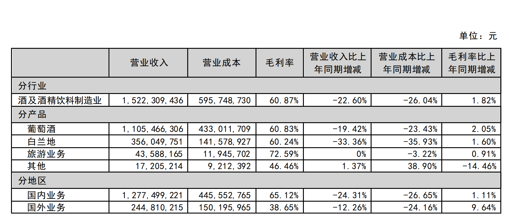 此外,分地区来看,张裕上半年在国内外市场都出现了下滑。其国内业务实现营收12.77亿元,同比下滑24.31%;国外业务实现营收2.45亿元,同比下滑12.26%。