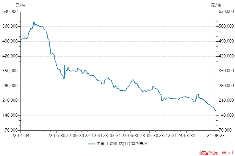 与锂价走势趋同,钴价近几年也经历了大起大落。钴价在2022年3月创下阶段高位以来,钴价下行趋势已持续两年有余。Wind数据显示,国内钴平均价自2022年3月的最高58.45万元/吨降至2024年8月23日的阶段低值16.10万元/吨,降幅超过70%。