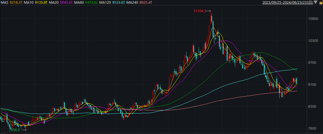 LEM铜自7月中旬以来,累积跌幅近6%,期间最大回撤约12%,最低报8,888美元/吨。近半年月,铜价反弹至9,300美元/吨附近,洛阳钼业股价走势也有所回升。