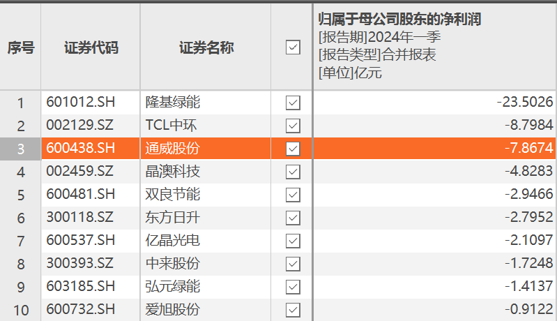 当前还有不少光伏巨头未披露2024年半年报,仅从2024年一季度看,诸如隆基绿能、通威股份、晶澳科技(002459.SH)当期归母净利均是大亏。