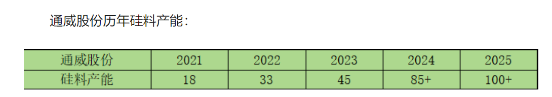 表现一是逆势加大硅料的投产。公开数据显示,2023年通威股份硅料产能在45万吨,2024年将达85万吨,2025年将升至100万吨。