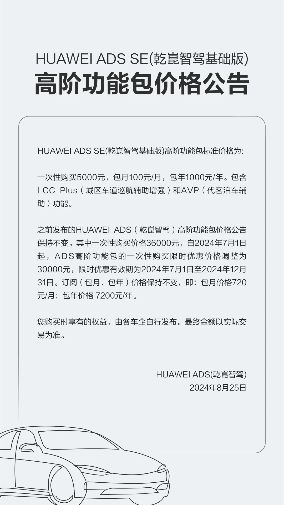 8月25日,华为公布HUAWEI ADS SE(乾崑智驾基础版)高阶功能包价格,一次性购买5000元,包月100元/月,包年1000元/年。包含LCC Plus(城区车道巡航辅助增强)和AVP(代客泊车辅助)功能。之前发布的HUAWEI ADS(乾崑智驾)高阶功能包价格公告保持不变。据了解,问界新M7 Pro版本将搭载乾崑智驾基础版,预售价格24.98万元,并将于8月26日正式上市。