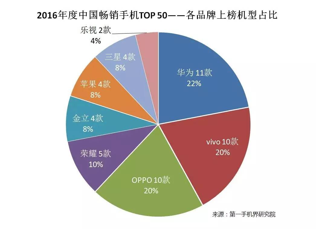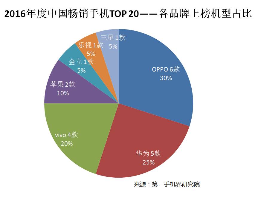 2016年度中国畅销手机TOP20中,OPPO有6款、华为有5款、vivo有4款、苹果有2款、金立、乐视、三星各有1款。