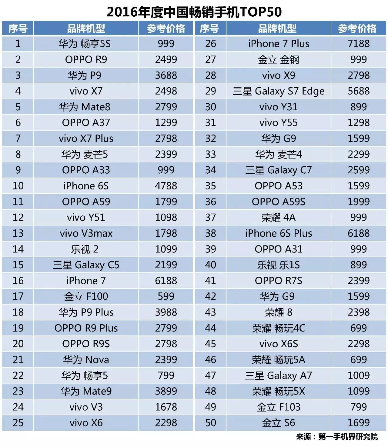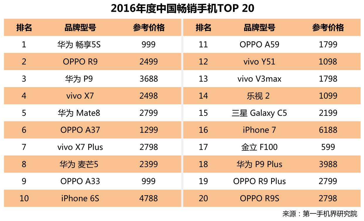 华为 畅享5S、OPPO R9、华为 P9、vivo X7、华为 Mate8、OPPO A37、vivo X7 Plus、华为 麦芒5、OPPO A33、iPhone 6S成为2016年度中国畅销手机TOP10。